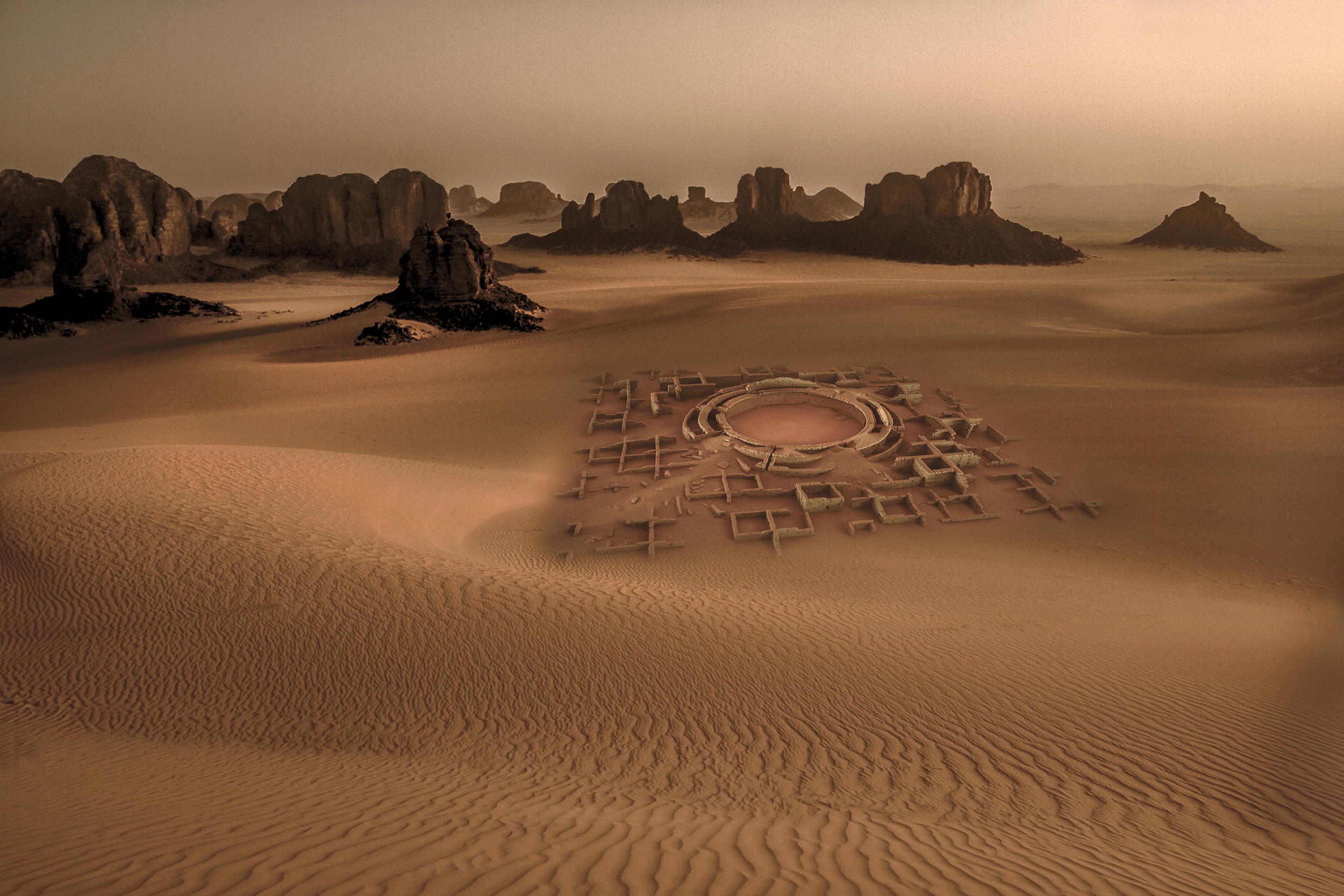 After firing, the elements were assembled into models and combined with sand tinted with ochre pigment.